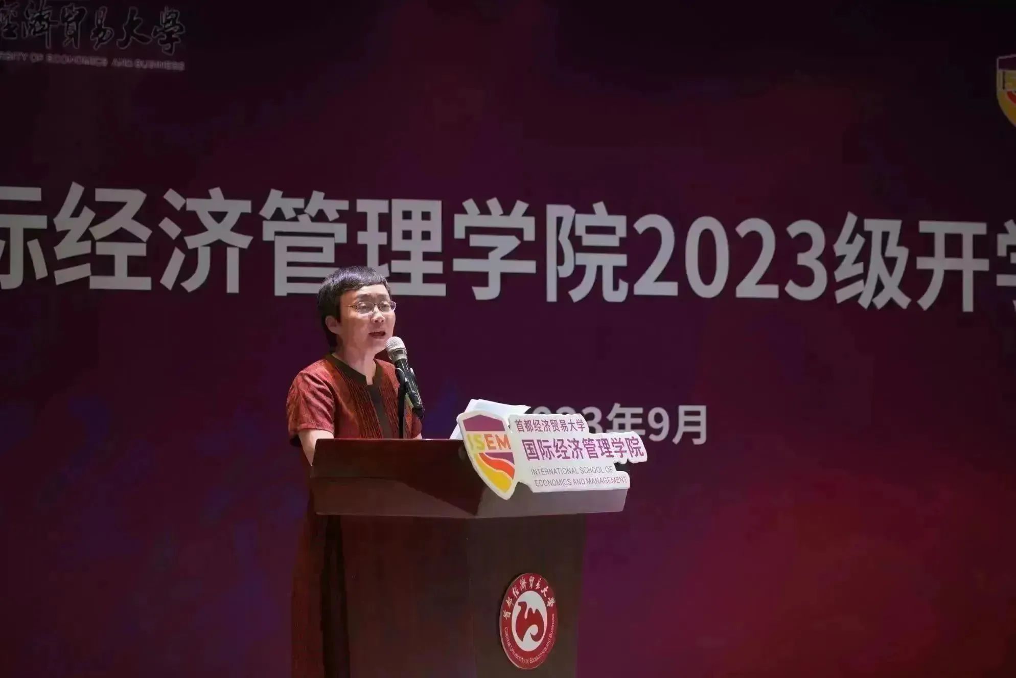 党总支书记曾庆梅向新生描绘了精彩的国经管生活。她强调了三点大学生应具备的美德:一是修身立德赓续民族精神,她希望同学们自觉树立和践行社会主义核心价值观,善于从中华民族传统美德中汲取道德滋养;二是志存高远确立人生航向,可以将目光望向未来、坚定走向明天,助力中国向上、民族向上、世界向上。三是脚踏实地扬起理想风帆,她希望同学们敢于尝试,勇于担当,乐于奋斗,用青春渲染时代最靓丽的底色,增强生逢盛世定不负盛世的责任感和使命感,将理想注入前进的步伐,做新时代的开拓者。