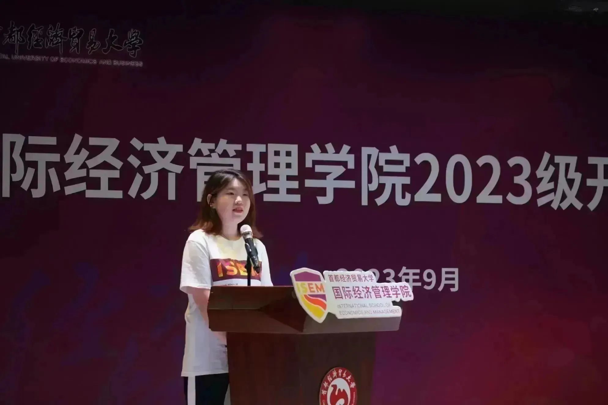 21级本科生何思涵代表全体国经管在校生发言,她分享了自己大学的生活点滴。她认为,学习是大学中非常重要的事情,但是除了成绩外,还要广泛发展自己的兴趣爱好、参加社会实践、志愿服务等活动。在过程中不仅可以提升自己的综合素质,强化社会责任感,还可以收获友情和珍贵回忆。